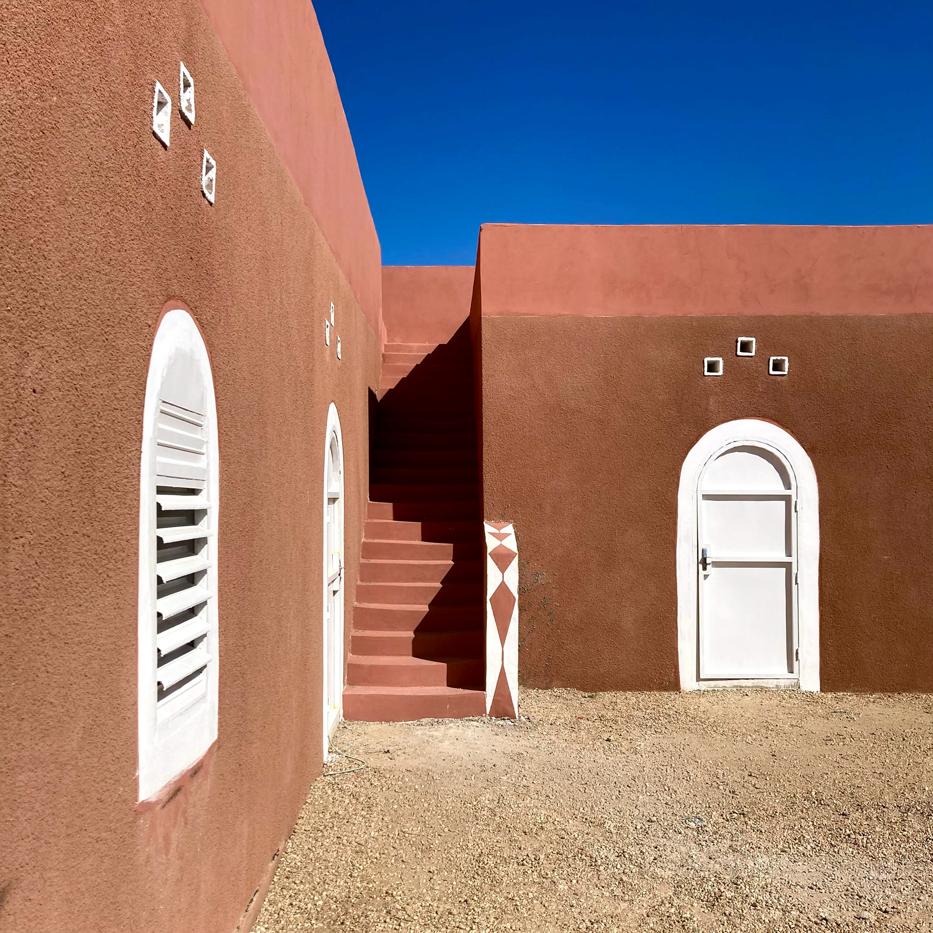 Techniques : concept technique Voûte Nubienne (adobes porteurs) / revêtements extérieurs sable-ciment ou terre-sable stabilisé au bitume.